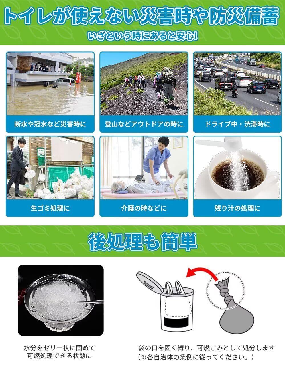 【高吸水性ポリマー、抗菌消臭効果バツグン】凝固剤が1包10gに増量で吸水量が従来品に比べ2倍にUP、汚物の水分を吸収し、ジェル状にするので、素早く清潔に処理できます。吸水性能が高く、汚物などでの処理にも適しています。災害時はライフラインが止まり、ゴミがすぐに出せず衛生環境が悪化しやすくなります。凝固剤は第三者機関での抗菌・消臭試験をクリアした確かな品質です。「抗菌」「消臭」機能がり、汚物を素早く凝固させ臭気の拡散を最小限に抑えます。災害時に悪化しやすい衛生環境や悪臭対策のお役に立ちます。