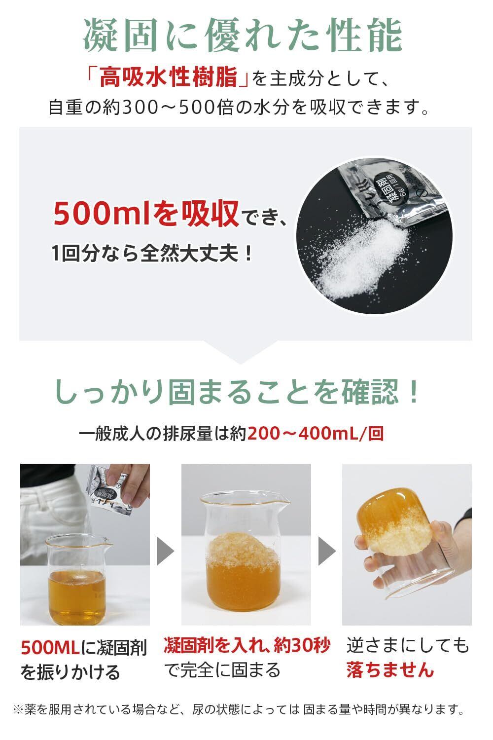 【 「消臭凝固剤」「抗菌性」「吸水力」】凝固剤はただ固めるだけではありません!排泄後の菌の増殖を防ぐ「抗菌性」のある凝固剤を採用!抗菌性試験も実施しており、非常時でも安心の抗菌性です!「抗菌性」に加えて「消臭性」も追求しています!凝固剤を使用した場合、アンモニアに対する消臭性を発揮します!凝固剤は500mlの水分をしっかりと固めてトイレのあとに廃棄しやすくなります。