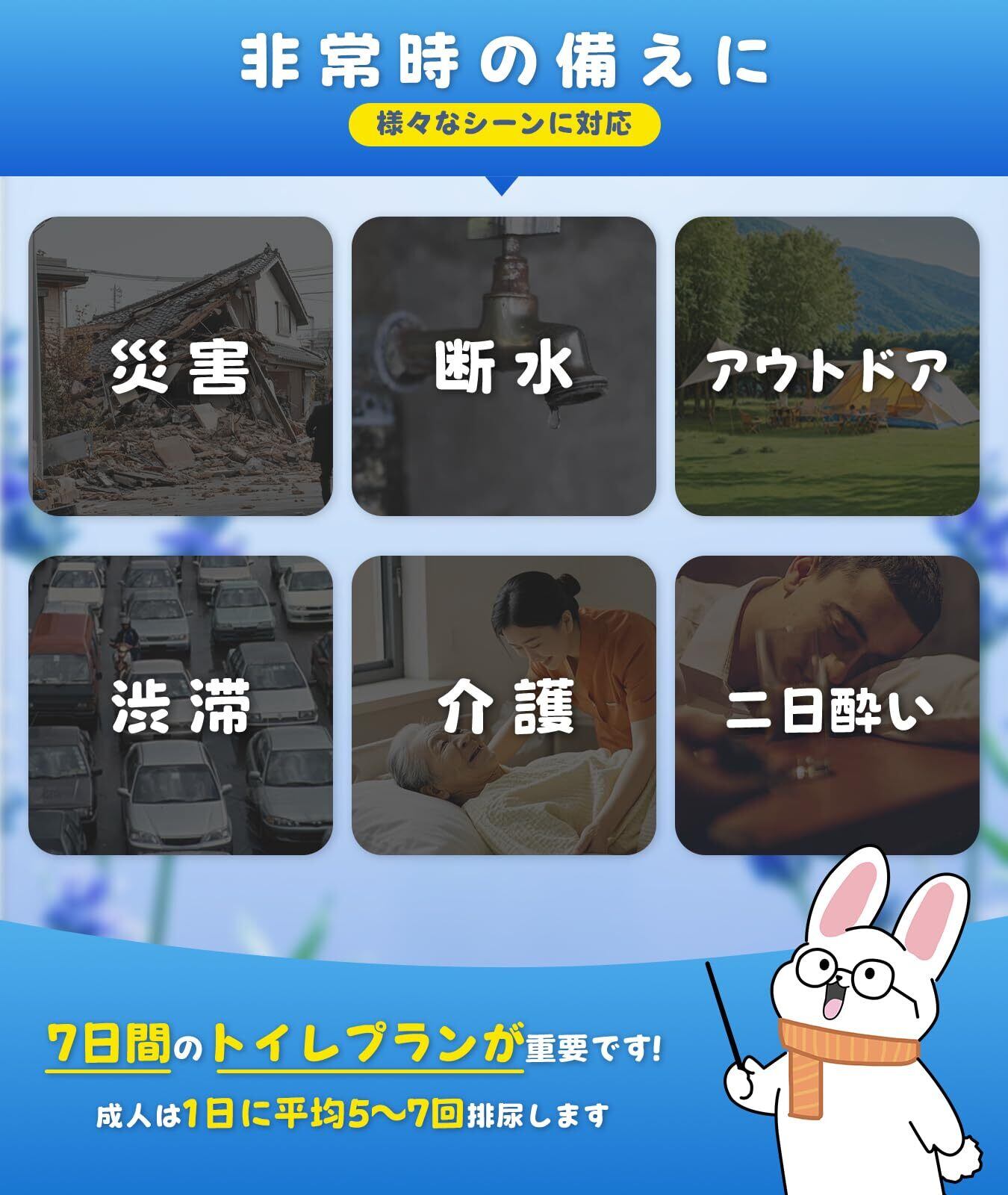 【用途が広い & 備蓄に最適】キャンプ、ハイキングなどのアウトドア活動で近くに水源がない場合にも、携帯トイレとして使用可能です。さらに、介護が必要な方、高齢者、身体障害者のポータブルトイレとしても活用できます。これらの非常用トイレは、災害対策用品、防災用品、緊急用トイレ、避難用品として備蓄するのに安全で信頼性の高い選択肢です。家庭、企業、地方自治体における携帯トイレや仮設トイレの備蓄としても最適です!