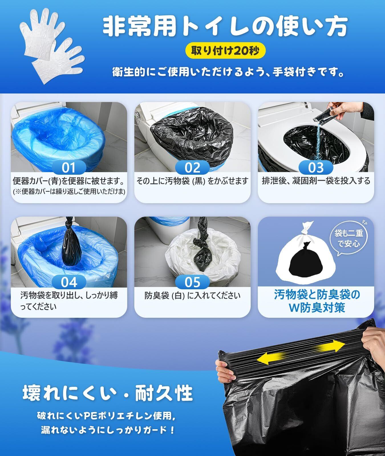 汚物袋と凝固剤がセットになっており、使い方は非常にシンプルです!初めての方やお子様、高齢者でも直感的に使える設計になっています。サポートも充実しており、緊急時の不安を軽減します。