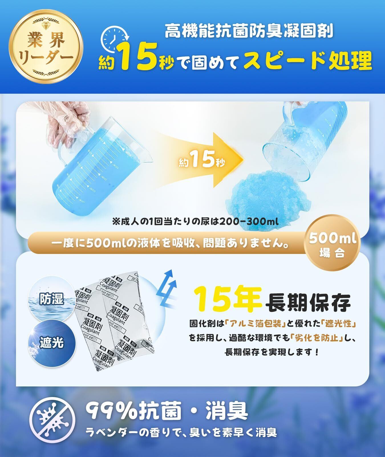 【高吸水性凝固剤&抗菌・消臭効果を兼備】非常用トイレ凝固剤は高吸水性樹脂を使用しており、1包7gで500mlの液体を吸収し、15秒で凝固します。さらに遮光・防湿性に優れたアルミ包装を採用しているため、過酷な環境でも劣化せず、15年の長期保存を可能にしました。防災トイレは抗菌・消臭効果に加え、厚手の汚物袋と30L大容量防臭袋を付属。三重の防臭構造で、嫌な臭いが漏れる心配がなく、生活の不便や不快感を感じることはありません。