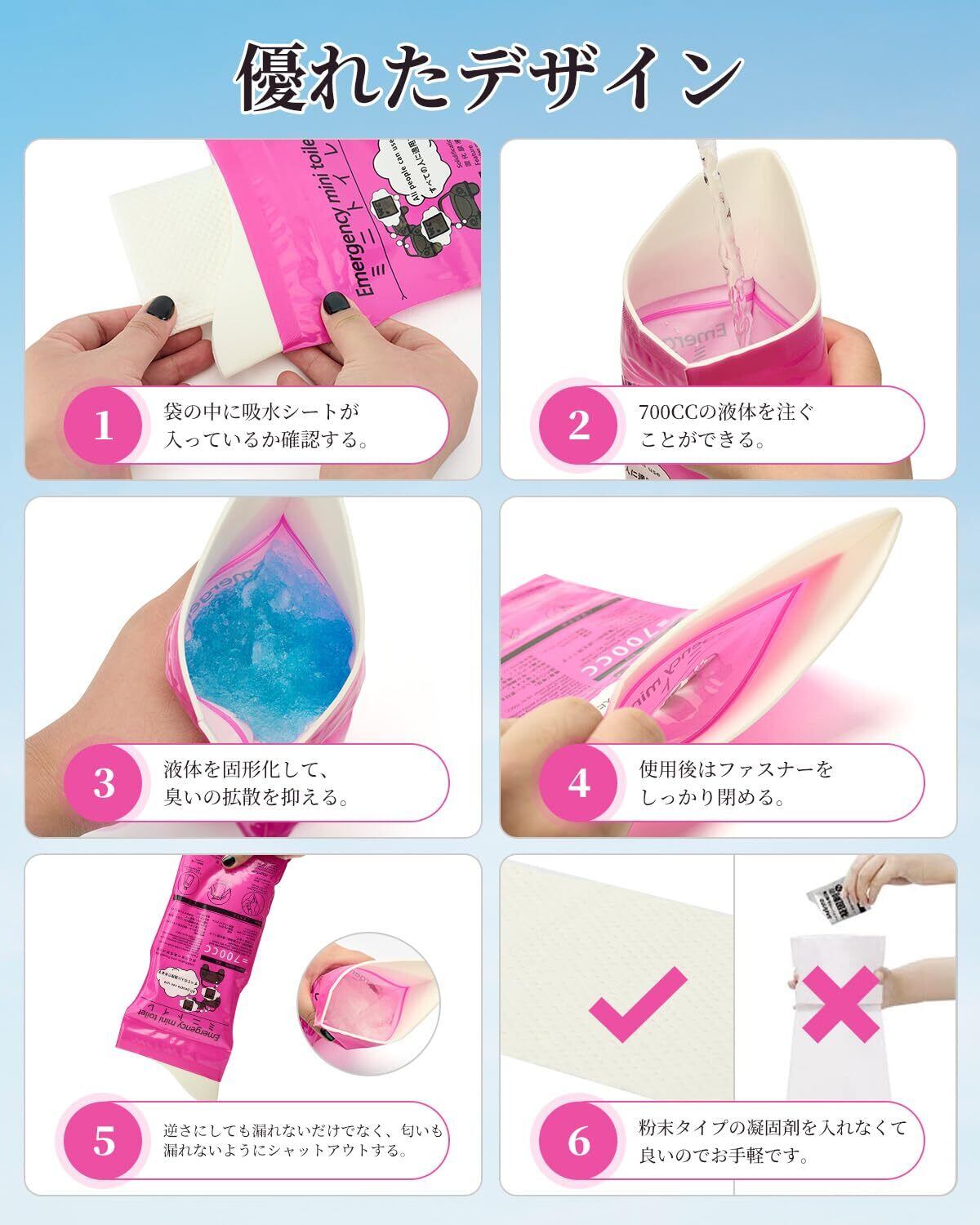 汚物袋と凝固剤がセットになっており、使い方は非常にシンプルです!お子様や高齢者でも直感的に使える設計で、いつでも安心です。緊急時の不安を軽減してくれます。