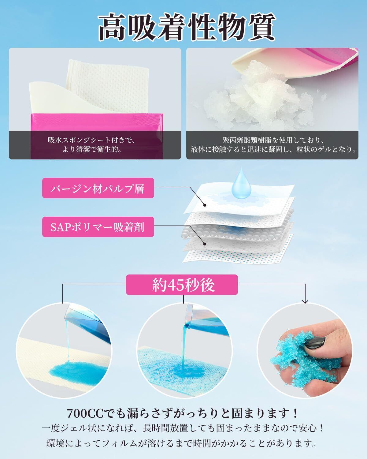 【45秒以内に吸収可能】ポリプロピレン・高分子吸収樹脂を使用しており、仮設トイレとして優れた吸収性と速乾性を持っています。液体廃棄物を素早く吸収し、臭いを消し、飛び散らせることなく無臭の粒状のジェルに変化します。わずか45秒でしっかりと液体を吸収し、すぐに固まります。さらに、長時間放置しても固まったままなので、安心して使用することができます。