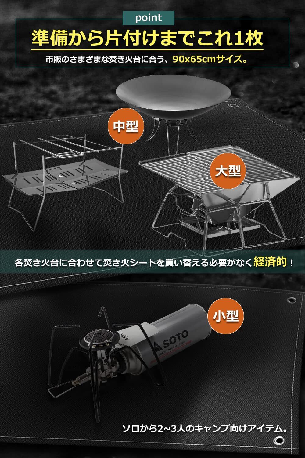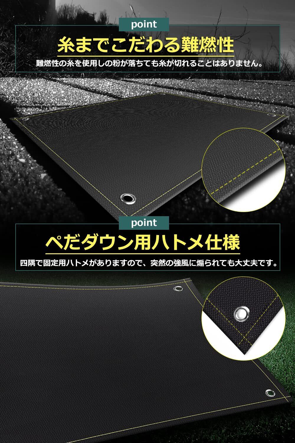 **このシートは難燃性素材を使用しており、安全に焚き火を楽しむ際の強い味方です!** 焚き火やバーベキューの際に、安心してお使いいただけます。