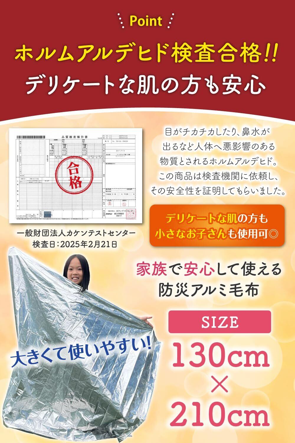 【ホルムアルデヒド検査合格!デリケートな肌の方も安心】 本製品は、人体に悪影響を及ぼす可能性のあるホルムアルデヒドの検査をクリア! 一般財団法人カケンテストセンターにて検査を行い、安全性が証明されています。お子様や敏感肌の方も安心してご使用いただけます。 検査機関:一般財団法人カケンテストセンター 検査日:2025年2月21日
