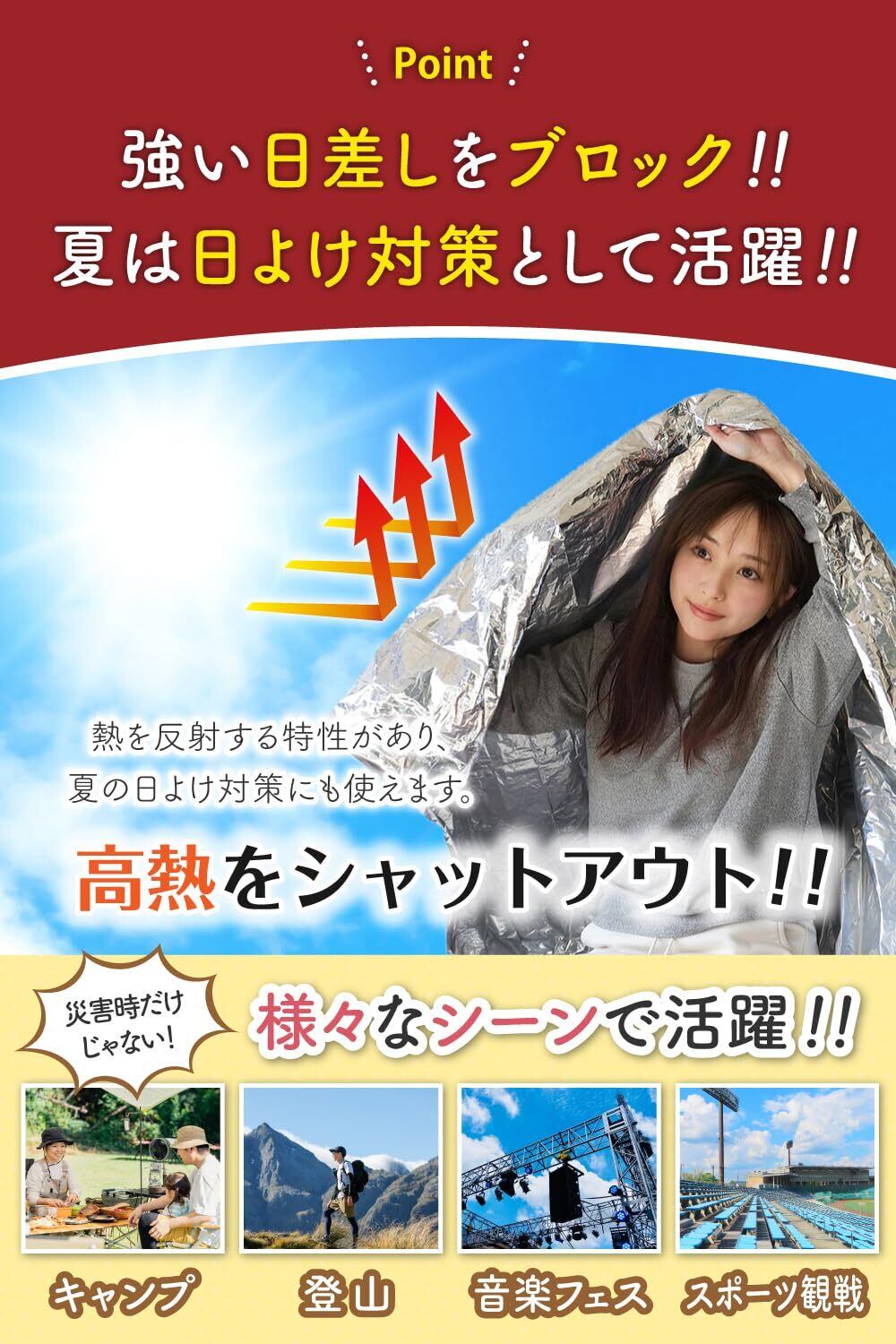 **さまざまなシーンで役立つアイテム!** 緊急時にはもちろん、登山やキャンプの保温対策としてもご利用いただけます。