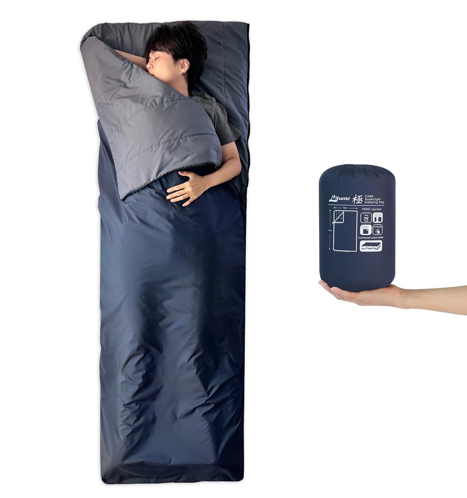 Litume コンパクトスリーピングバッグ 20°C-10°C,720g、組み合わせ可能な軽量ポータブルパッカブルスリーピングサック、大人用、バックパッキング、キャンプ、ハイキング、旅行、ファミリー用、スタッフサック付き、3シーズン対応、ベルベットライニング
