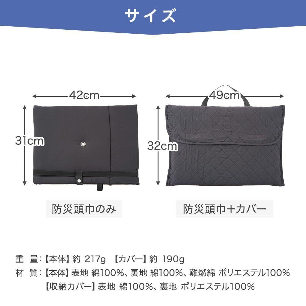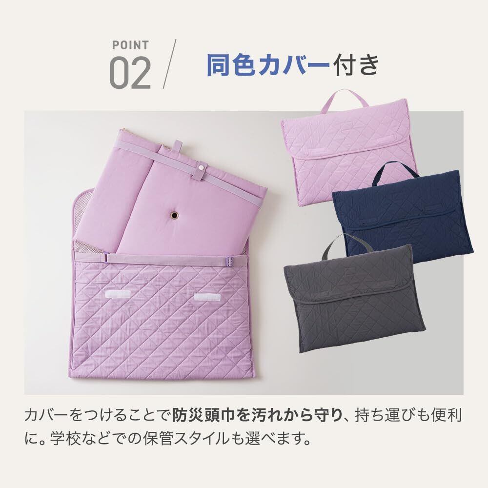 防災頭巾+収納ポケットの付いた便利な同色カバー付きの2点セット。クッションは耳穴付きでしっかり頭、肩を守ります