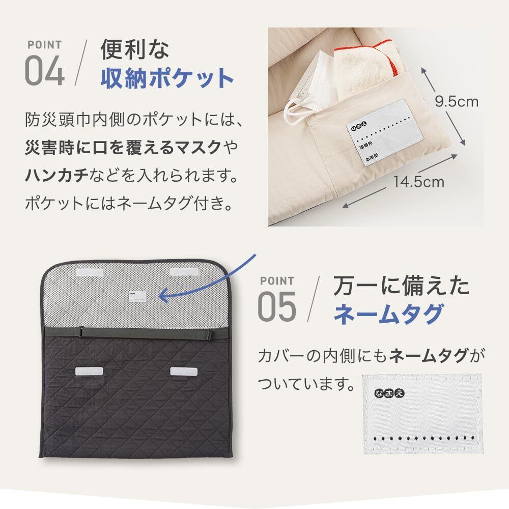防災頭巾は内側に収納ポケットがあり、災害時に口を覆うマスクやハンカチを入れられます。防災頭巾本体・カバーには「お名前」「連絡先」「血液型」を記入できるネームタグが付いています。