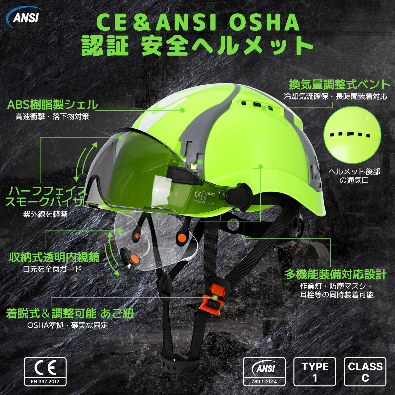 \【◆安全ヘルメット 建設用ヘルメット 産業用安全帽 工事用 サングラス&透明ゴーグル収納 耐候性 グリーン 調節可能 通気性 軽量 Xストライプ EN397規格準拠 : 安全性と快適さを両立した革新的ヘルメット!】/