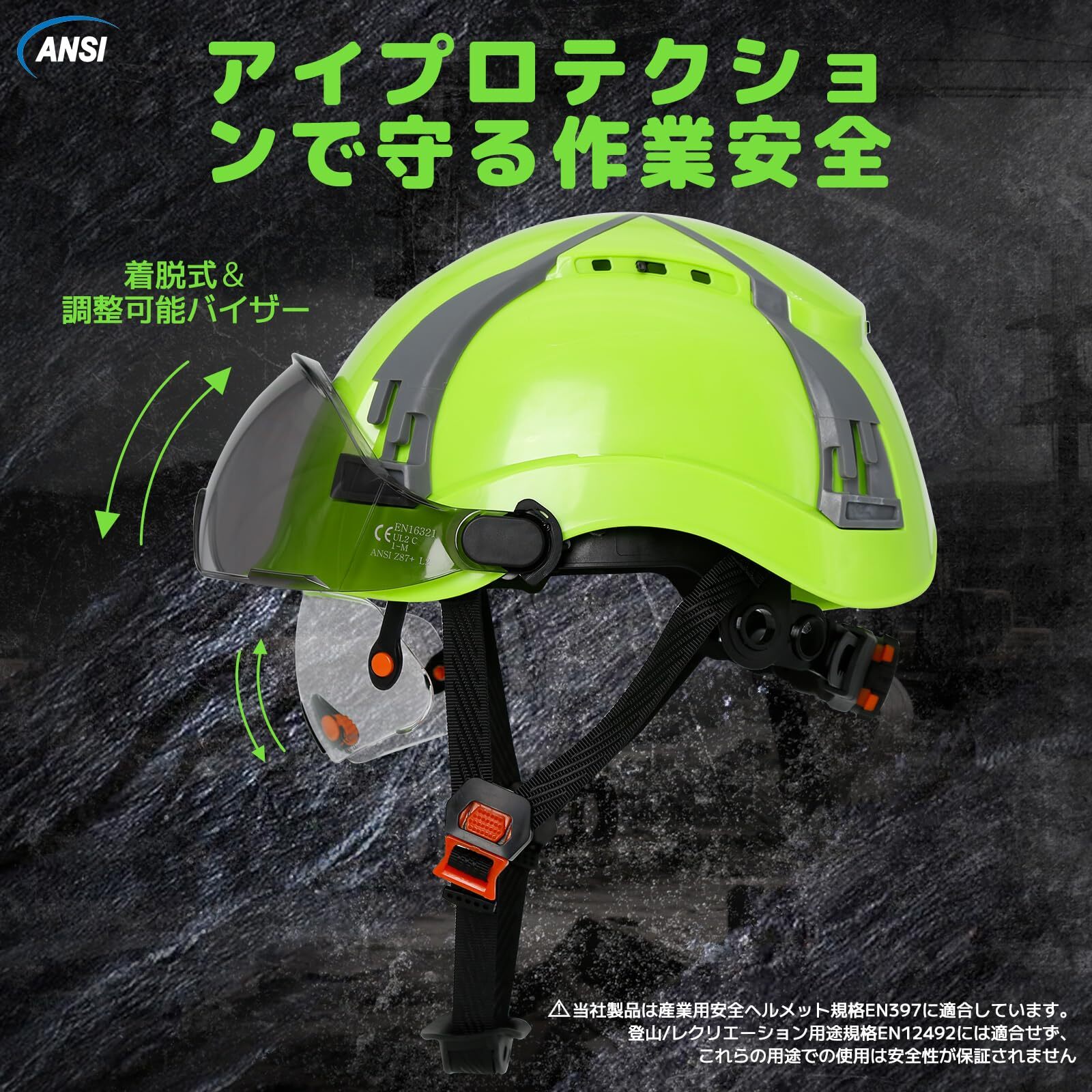 多機能産業用ヘルメット - EN397認証取得モデル:この通気性ロープロファイルヘルメットはバイザー付属で、建設現場、工場作業、メンテナンス、足場作業など、幅広い産業用途に対応。EN397産業用安全規格に完全準拠しており、頭部と視覚の保護を同時に実現します