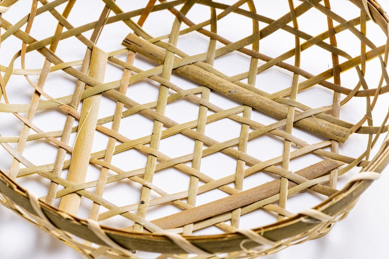 <商品の魅力> ●天然竹」:天然竹を使用。素朴な色合いと自然な質感が魅力です。 ●素朴な「六つ目編み」:しなやかな竹ひごを六角形に編み上げる伝統技法。光を通す軽やかな見た目と、竹本来のしなりが生み出す曲線が美しいデザインです。 ●素材の持つ温かみ:職人が一つひとつ編み上げています。手作りならではの温もりと、均一ではない自然な風合いが感じられます。 ●サイズ/φ21xH4.5天然素材で手編みしておりますので、サイズ表記や色味等は若干のばらつきがございますのでご了承ください。