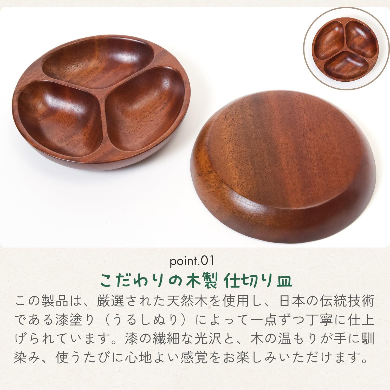 食卓を彩る、美しく便利な3仕切り皿」 天然木と漆塗りの美しい仕上がりが、食卓に温かみと高級感をプラスする「木製漆塗り 仕切り皿 」。料理を引き立て、使うたびに心が和む一品です。ぜひ、この機会にお試しください。