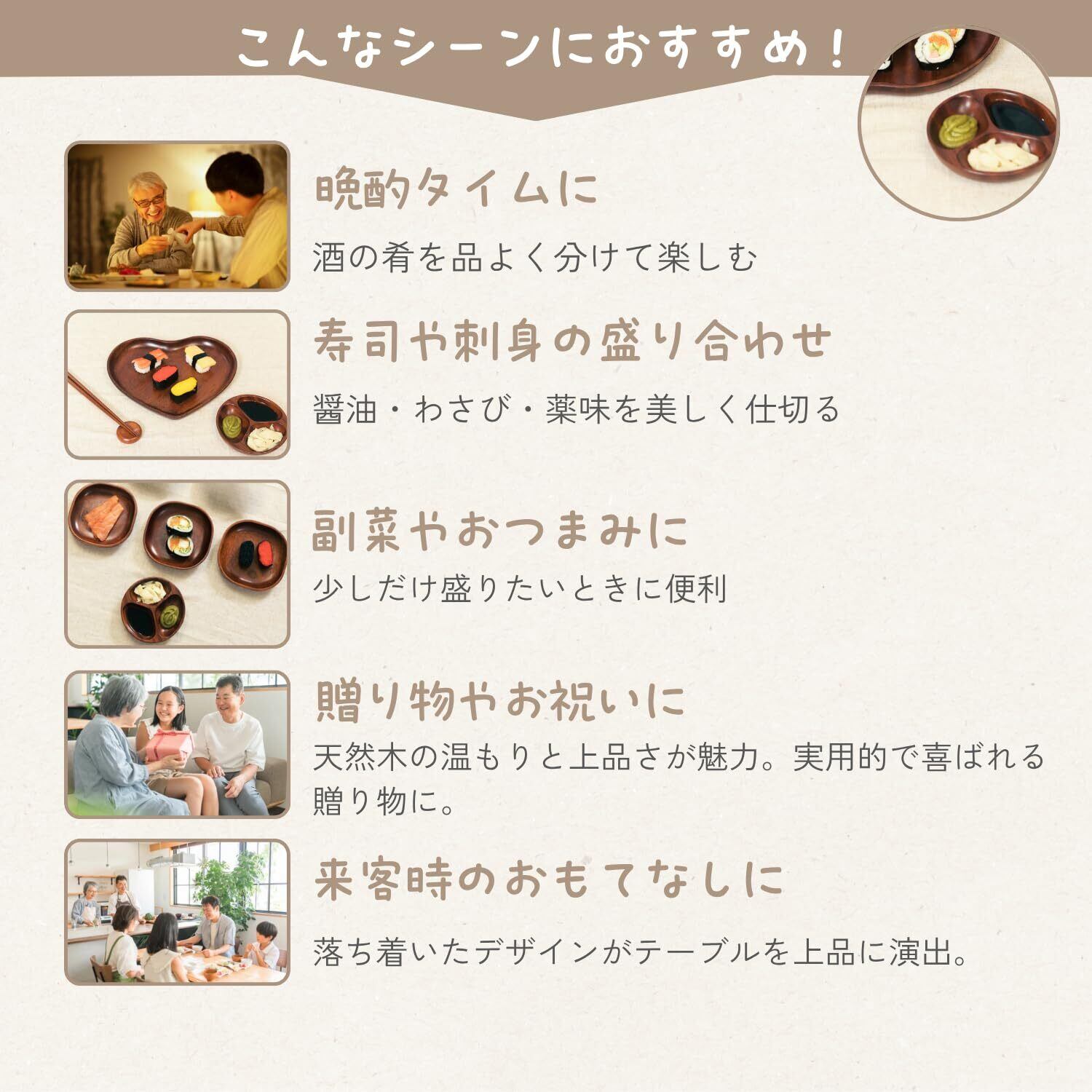 【 家庭での使用に最適 】薬味皿、仕切り皿、小分け皿として、寿司や刺身の付け合わせだけでなく、お菓子やフルーツ、ナッツなどを分けて盛り付けるのにも便利。家庭用として特に使いやすく、プレゼントや引っ越し祝いにも喜ばれるデザインです。