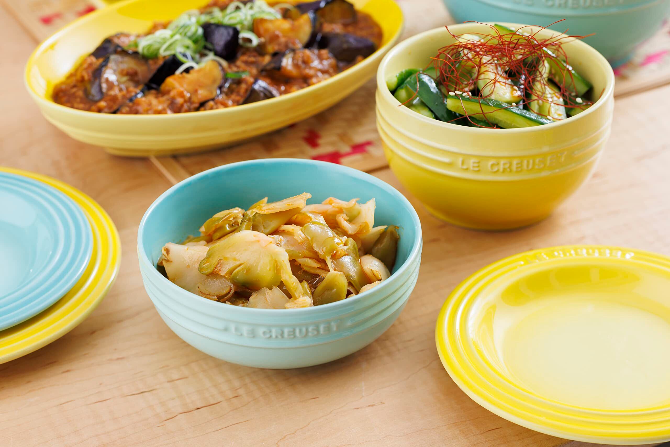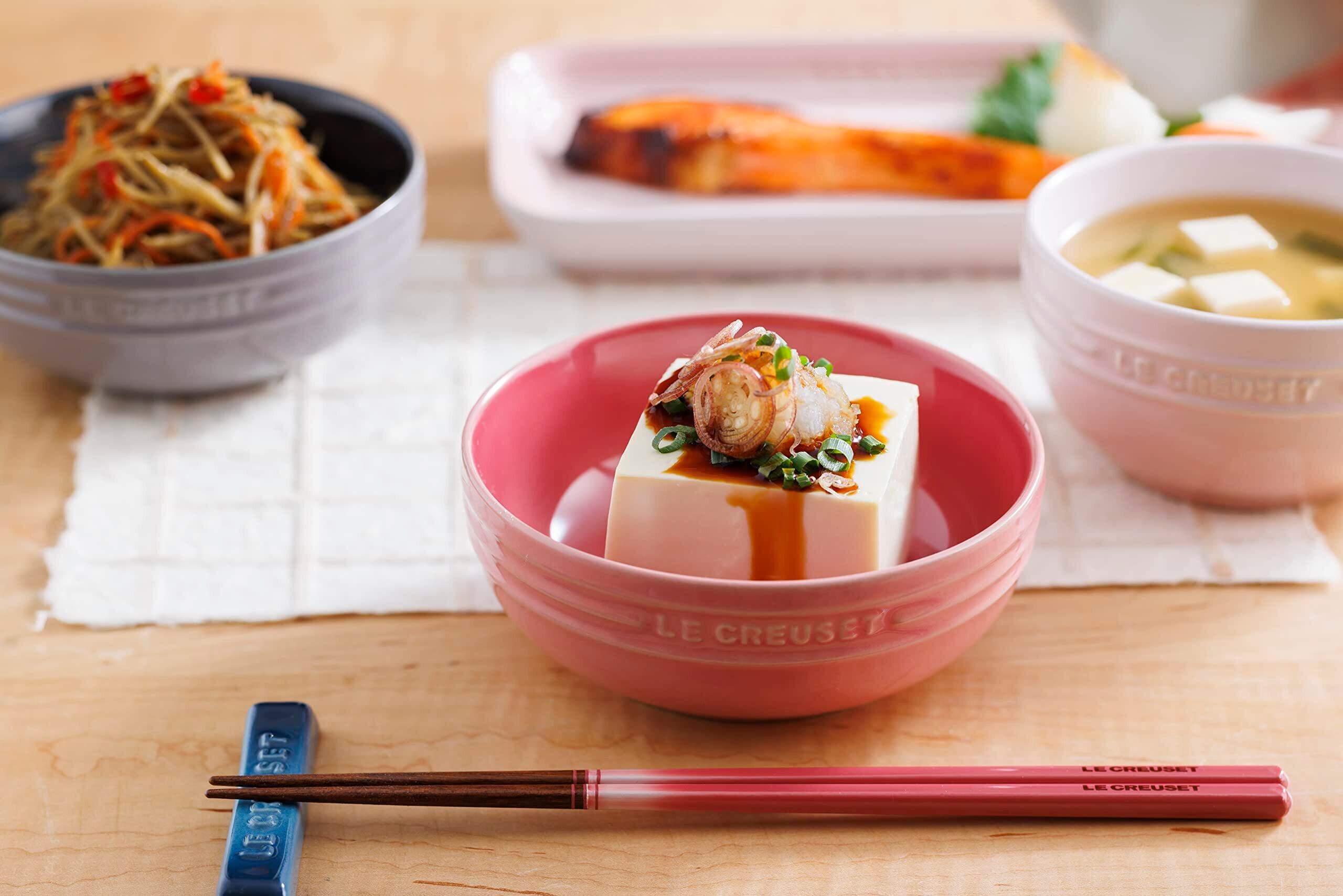ル・クルーゼを象徴するスリーリングとロゴがさりげないアクセントのシンプルなデザインは、和洋を問わずどんな料理も引き立てます。