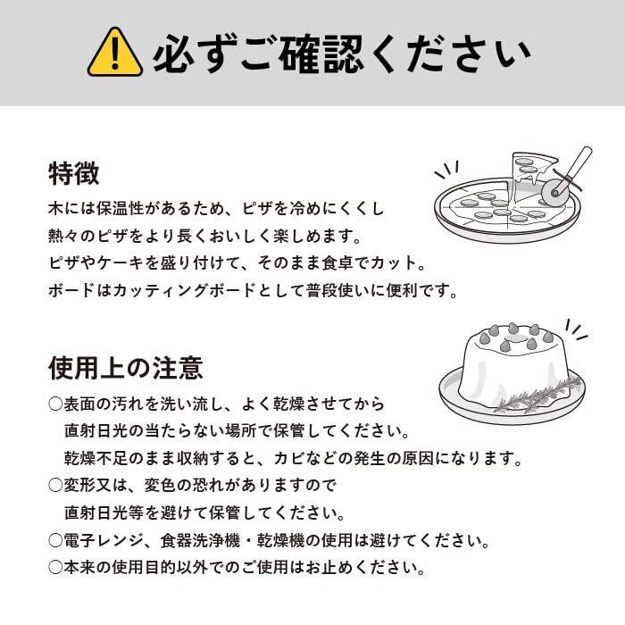 【材質】ピザボード/天然木(ポプラ)(ウレタン塗装)・ピザカッター/ステンレス鋼、天然木(ブナ)【単品サイズ】ピザボード/約径32×高1.4cm・ピザカッター/約径6×全長17cm【単品重量】450g