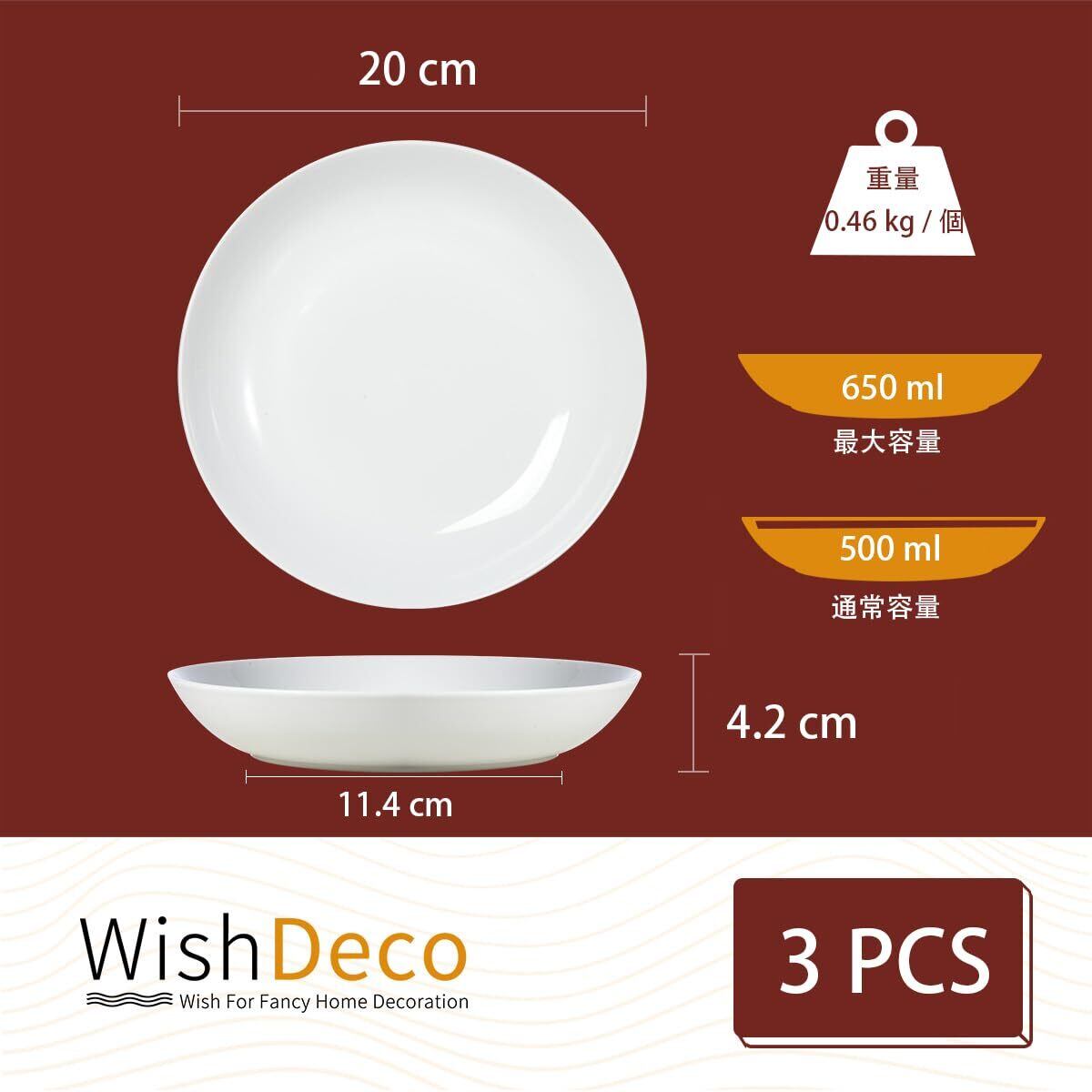 多用途の深皿: WishDecoホワイトボウルを各セットに3つ含みます。これらの食器の容量は 650 ml ( サイズ: Φ 20 x H 4.2 cm、重量:0.45 kg / 個 )で、お気に入りのカレー、パスタ、ラーメン、スープ、オートミール、デザート、フルーツ、ポップコーン、ナチョスを楽しむのに最適です