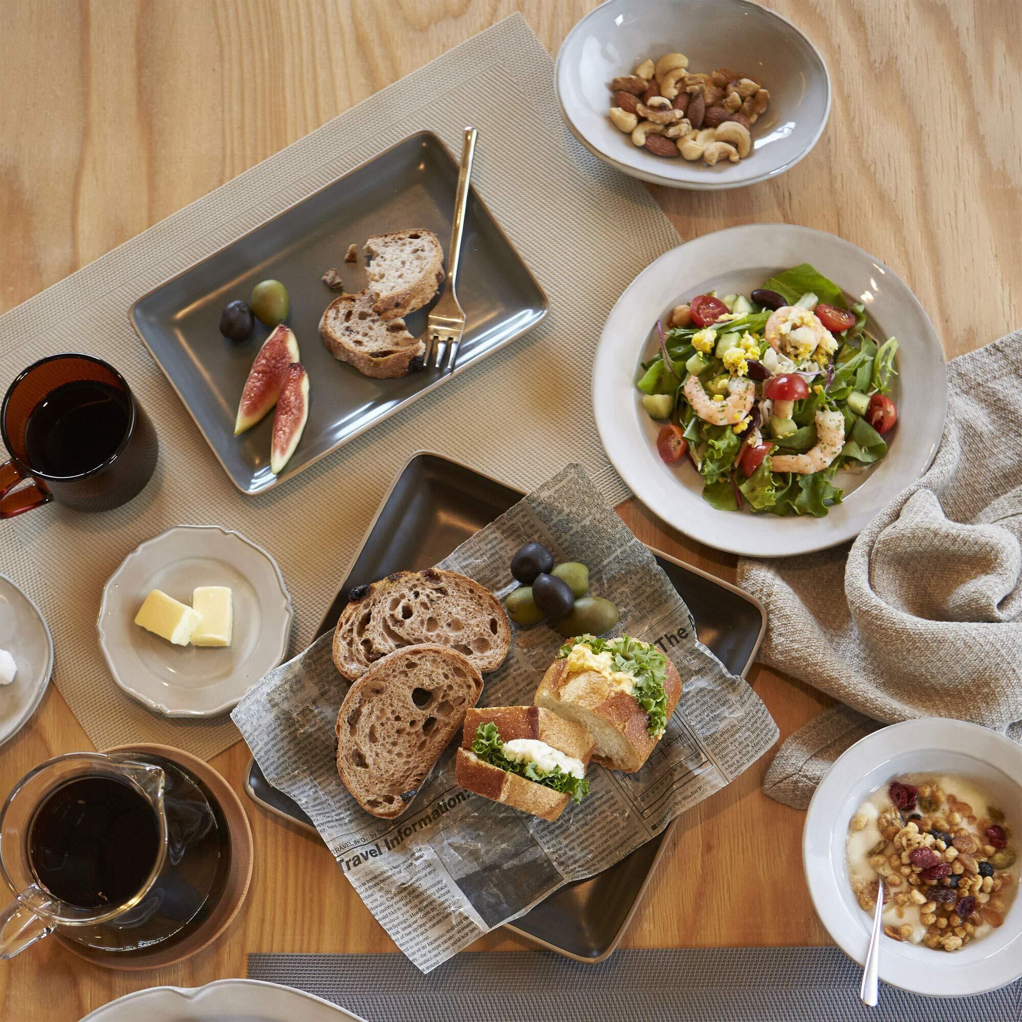 エッジラインシリーズにスクエアタイプが加わりました。何気なく料理を盛りつけても、洗練された印象にまとまりやすいのがスクエアタイプの強み。ラウンドライプと組み合わせてワンランク上のコーディネートを楽しんで。