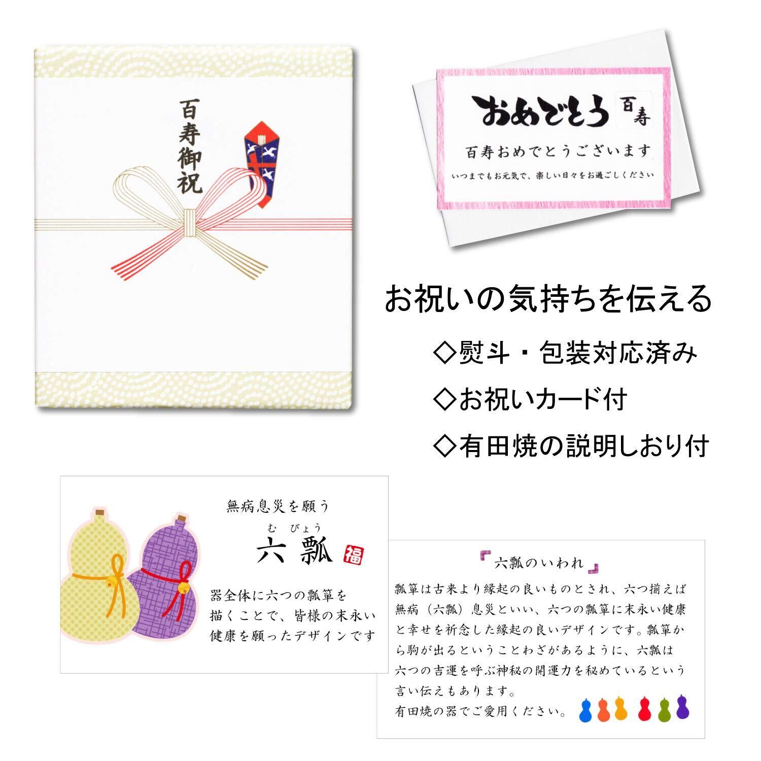 \【◆百寿のお祝い 無病息災を願った縁起物ギフト 有田焼 湯呑み 茶碗 飯碗 セット 花六瓢 青 百寿熨斗・メッセージカード付き 木箱入り: 大切な方の百寿を祝う特別な贈り物!】/