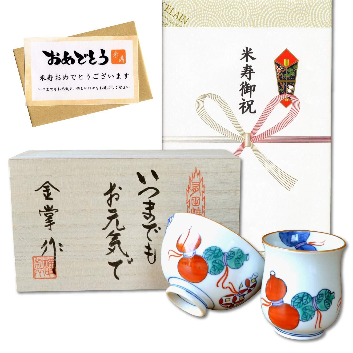 米寿祝い 無病息災を願った縁起物ギフト 有田焼 湯呑み 茶碗 飯碗 セット 鍋島六瓢 赤 のし・メッセージカード付き 木箱入り