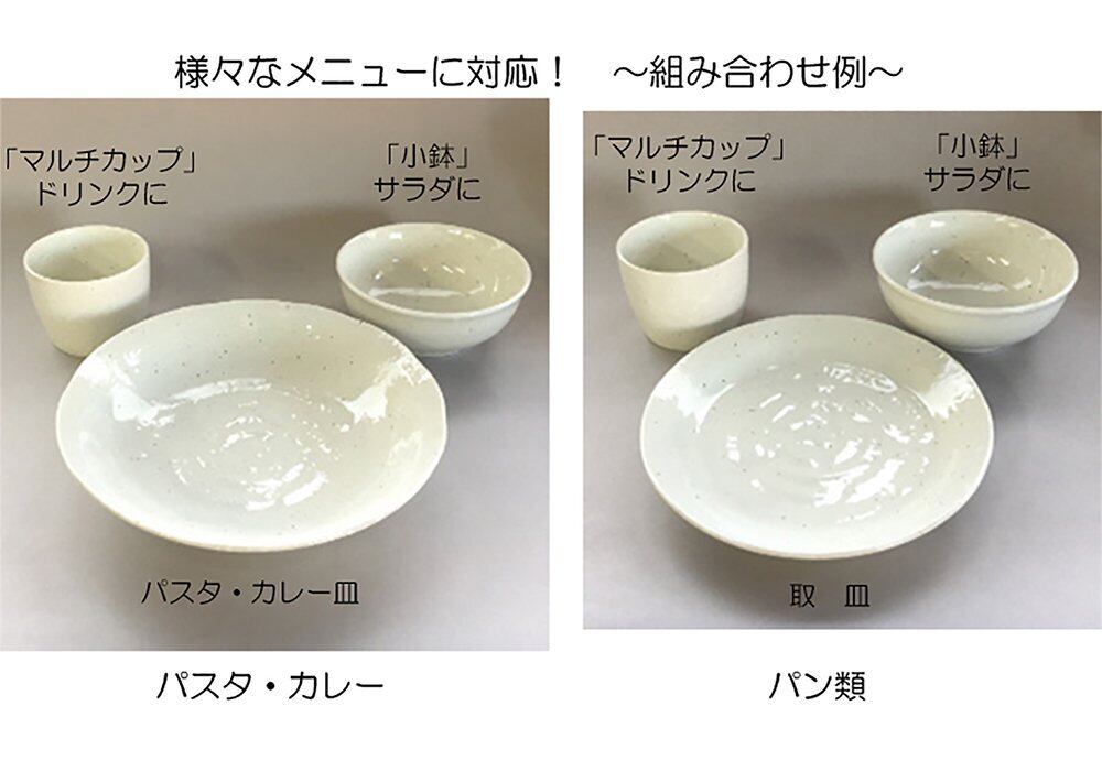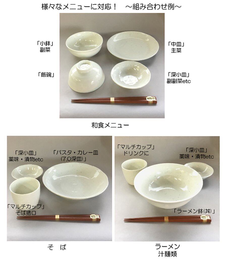 セット内容:(1)飯碗 (2)マルチカップ (3)深小皿 (4)小鉢 (5)取皿 (6)パスタ・カレー皿 (7)ラーメン鉢 (8)箸 ×各2個