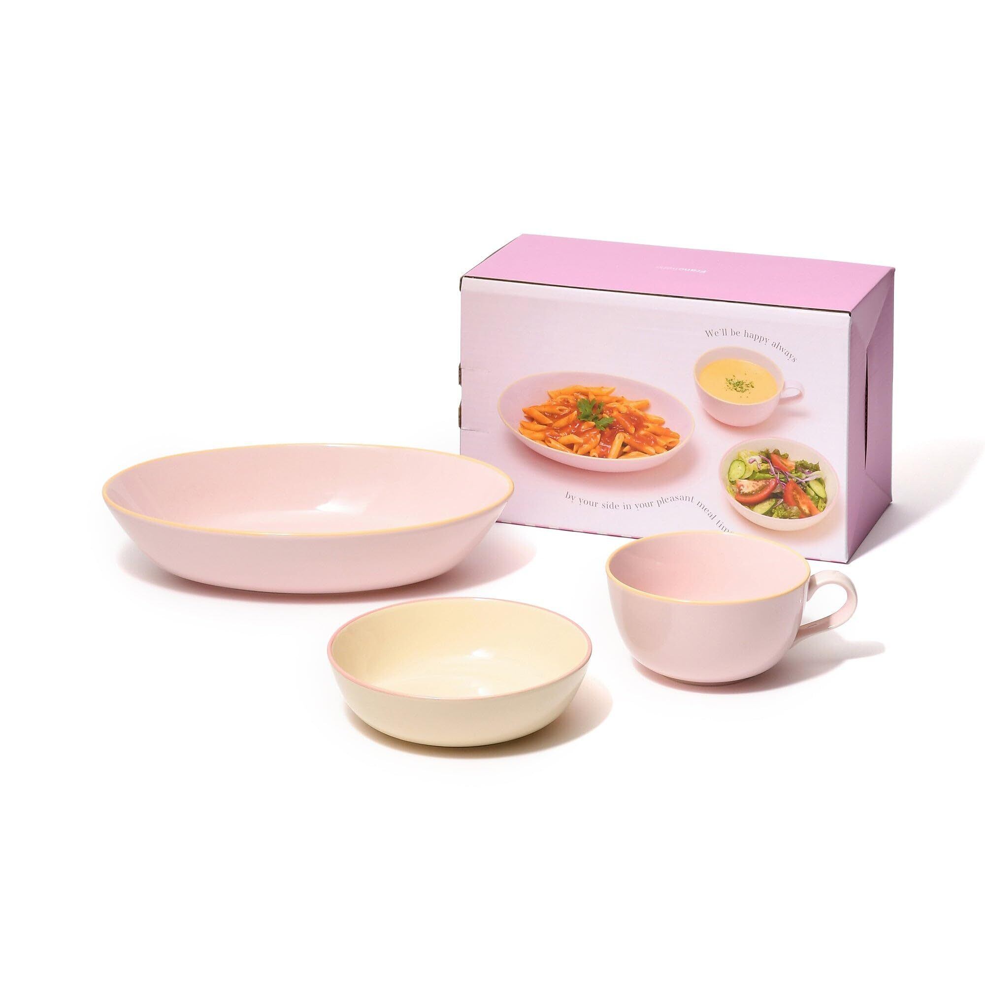 **お皿、ボウル、カップの3点セットで、さまざまな料理に対応!** 一人暮らしの方や新婚生活を始める方に最適なサイズ感で、気軽に使えます。