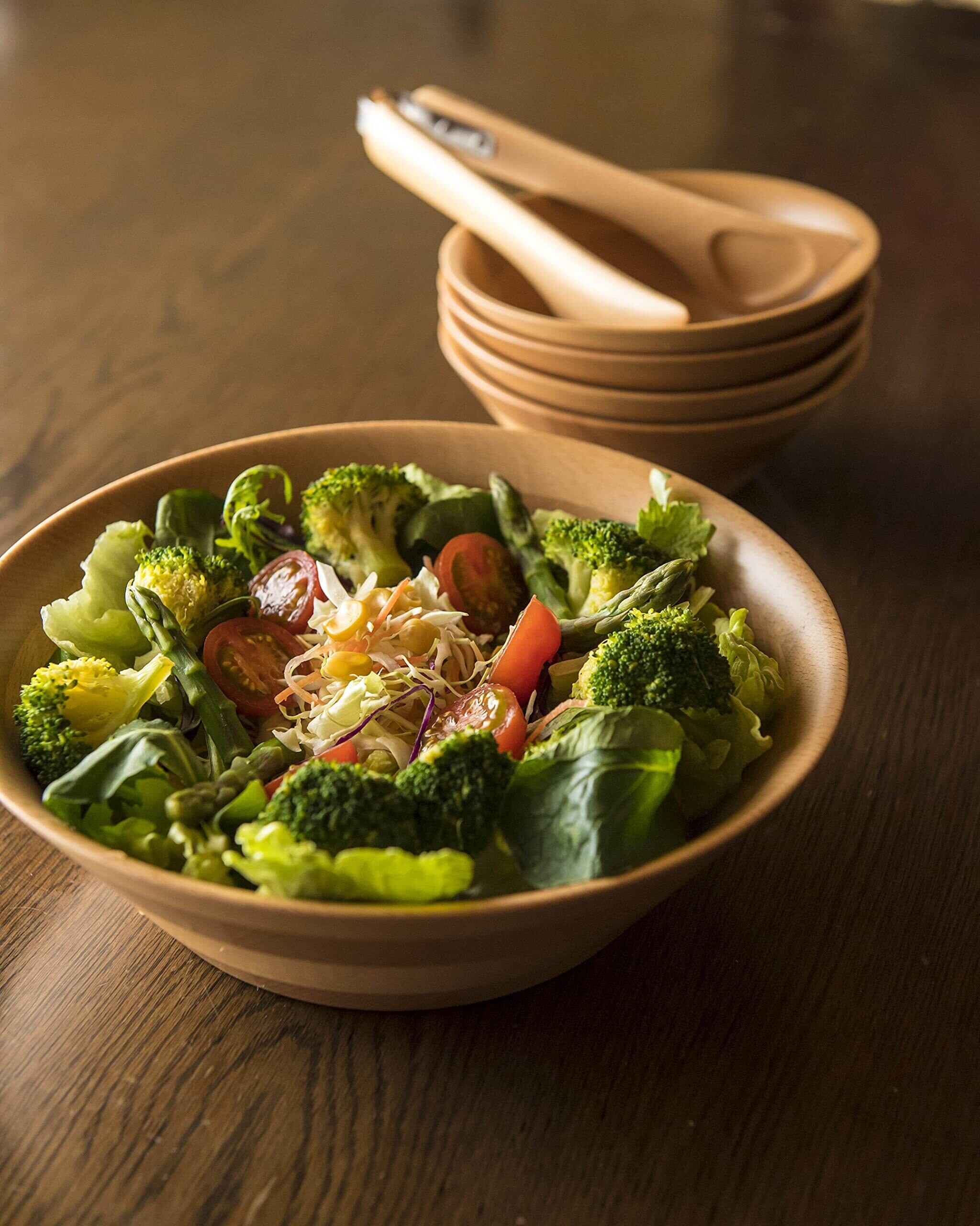 **木製とは思えない薄型デザインが特徴です!** 軽量ながらも、安心して料理やサラダを盛り付けることができます。見た目の美しさと実用性を兼ね備えた一品です。