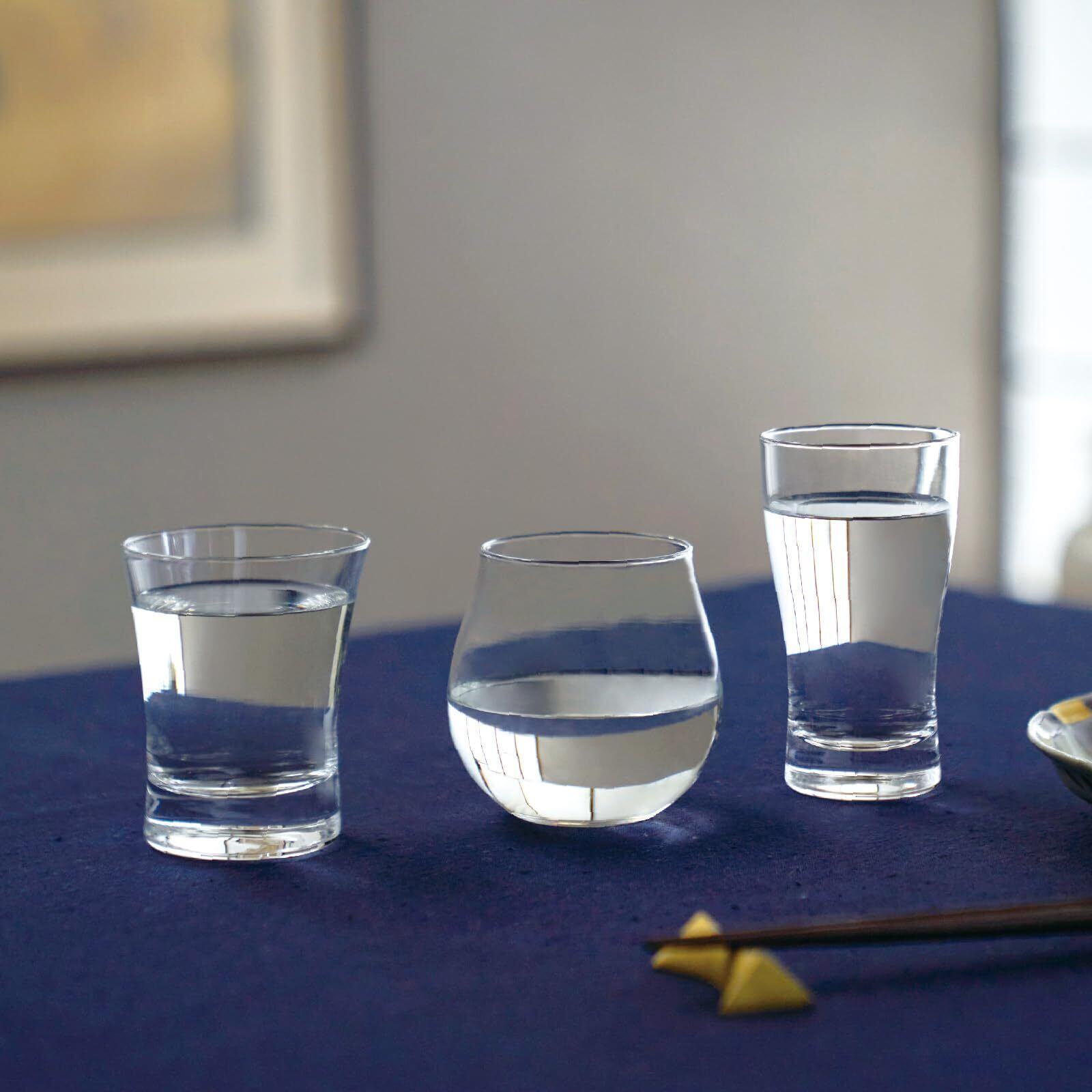 お酒の個性を引き立たせる「さらり」「ふわり」「きりり」の3タイプのグラスを揃えました。いずれも日本酒を半合(90ml)入れて、こだわりの日本酒をお好みのグラスで飲みくらべてみてください。