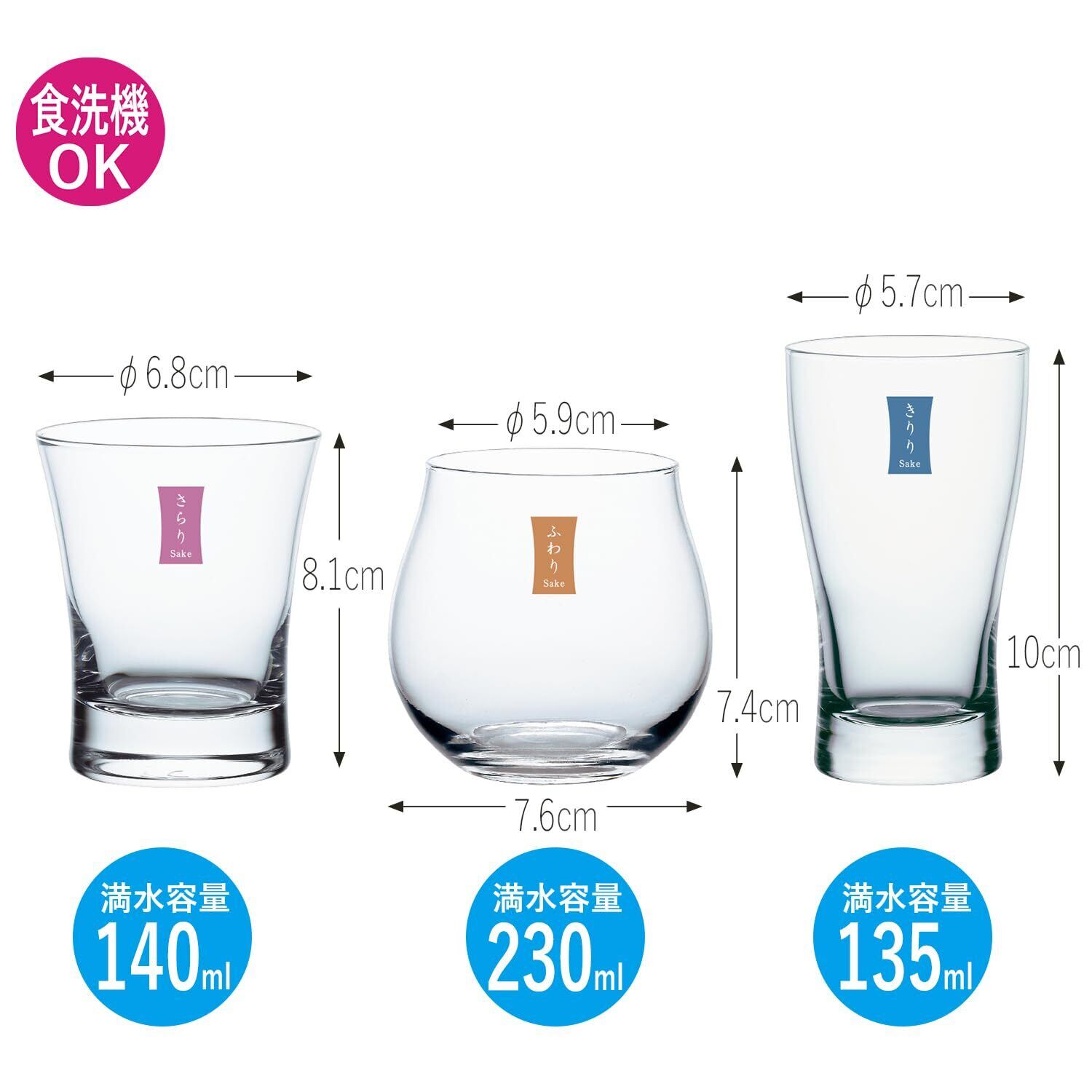 酒ぐらす(さらり):φ68×H81・M68mm<br>酒ぐらす(ふわり):φ59×H74・M76mm<br>酒ぐらす(きりり):φ57×H100・M57mm