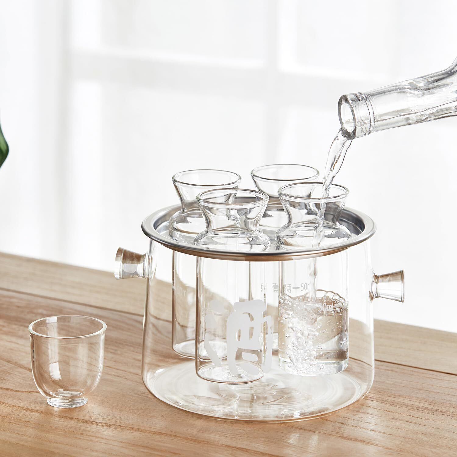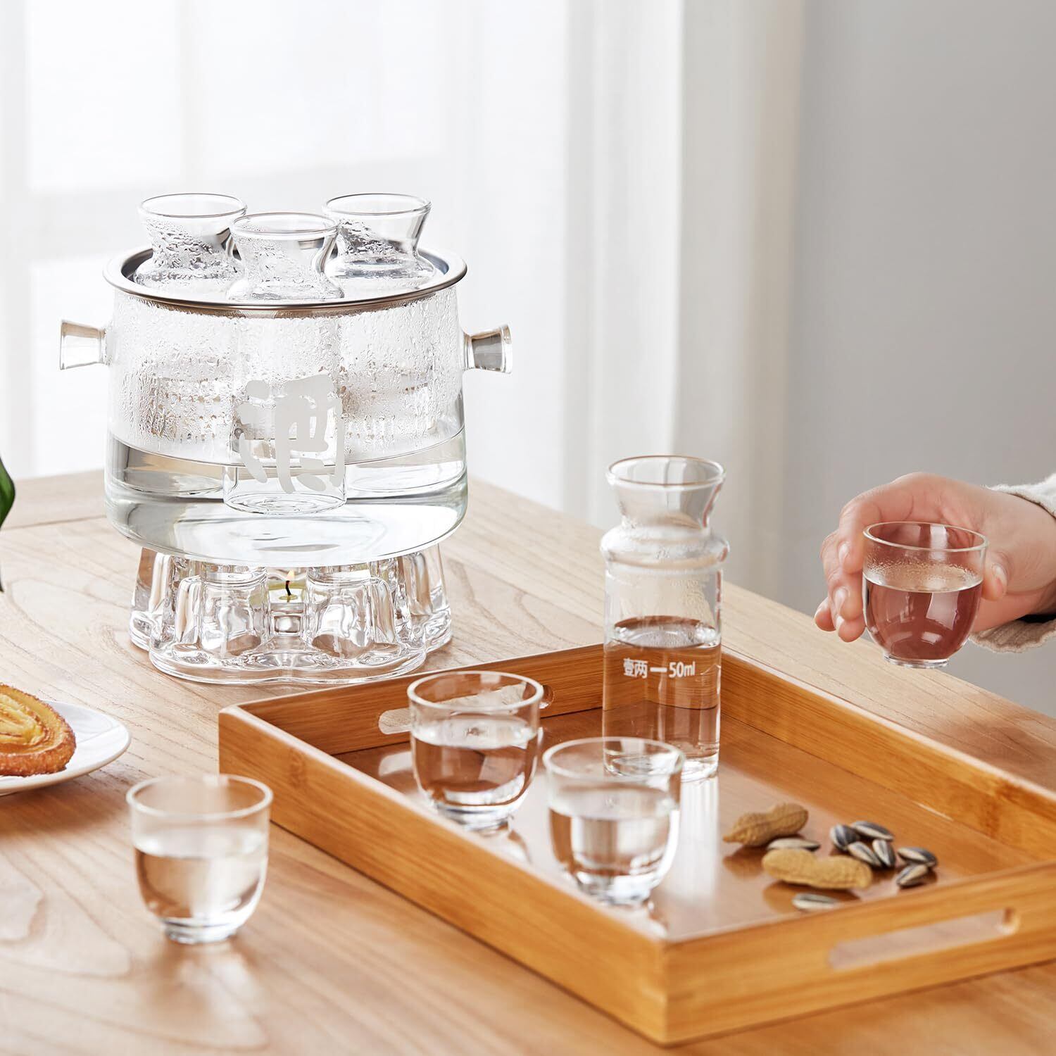 多用途に対応: 日本酒はもちろん、焼酎など様々なお酒に対応。美しいガラス製分酒カップが、お酒の色と香りを一層引き立てます。容器に氷や冷たい水を入れることで、冷酒としてもお楽しみいただけます。また、分酒器とステンレス製のスタンドを取り外せば、耐熱ガラス鍋としてもご利用いただけます。水を入れてガスコンロの弱火で加熱することで、インスタントラーメンやスープを作ることもできます。