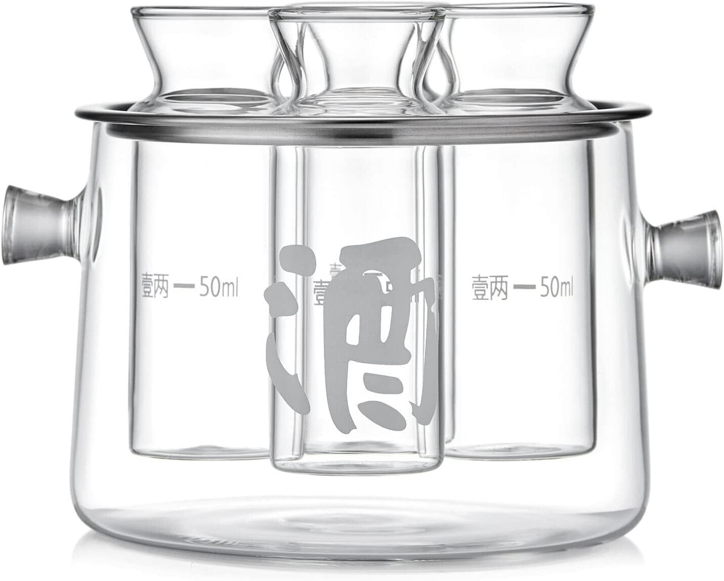 POKALOTEA 酒燗器 熱燗器セット 耐熱ガラス 耐熱温度差170度 湯煎式お燗器 酒かん器 酒器セット四つの目盛り付き分酒器 ガラス本体 ステンレス製スロット付き 徳利 日本酒 カップお酒 焼酎