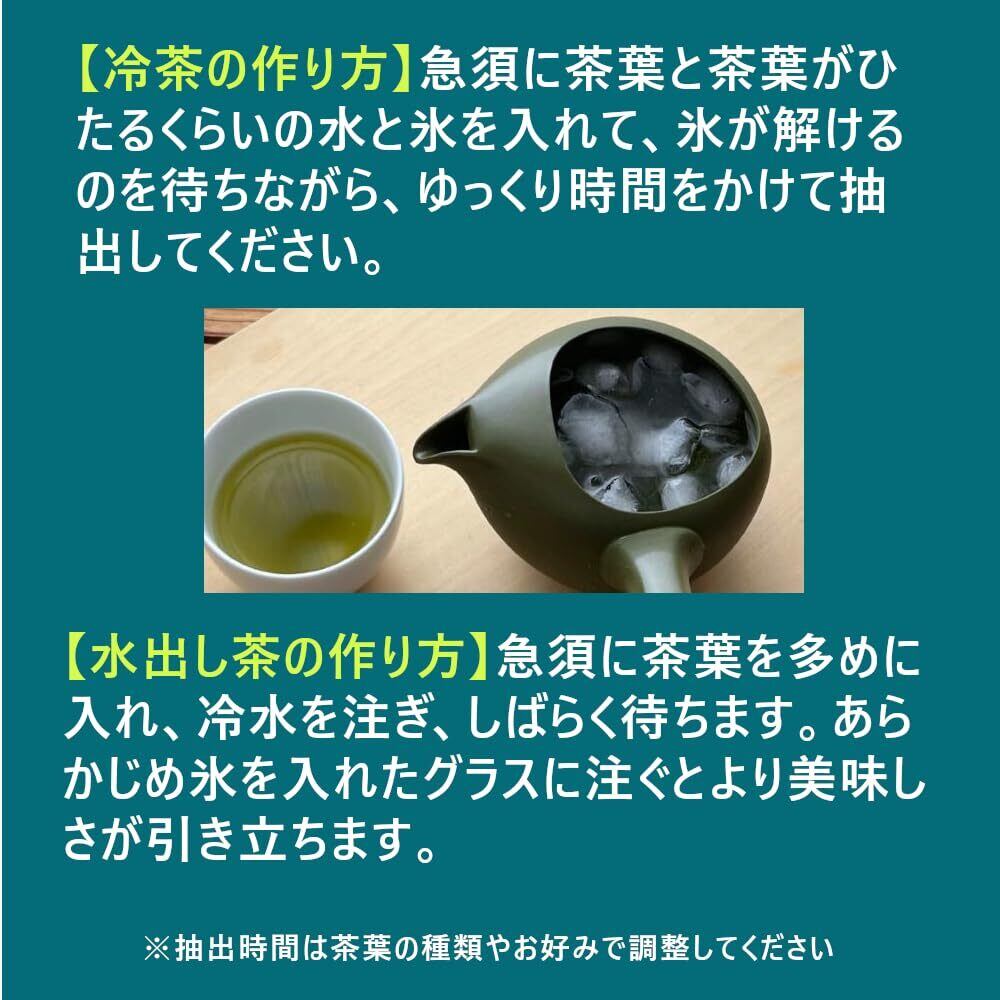 【冷茶の作り方】急須に茶葉と茶葉がひたるくらいの水とその上に氷を入れて氷が解けるのを待ちながら、ゆっくり時間をかけて抽出して下さい。【水出し茶の作り方】急須に茶葉を多めに入れ、無味無臭の軟水を注ぎ、しばらく待ちます。あらかじめ氷を入れたグラスに注ぐとより美味しさが引き立ちます。